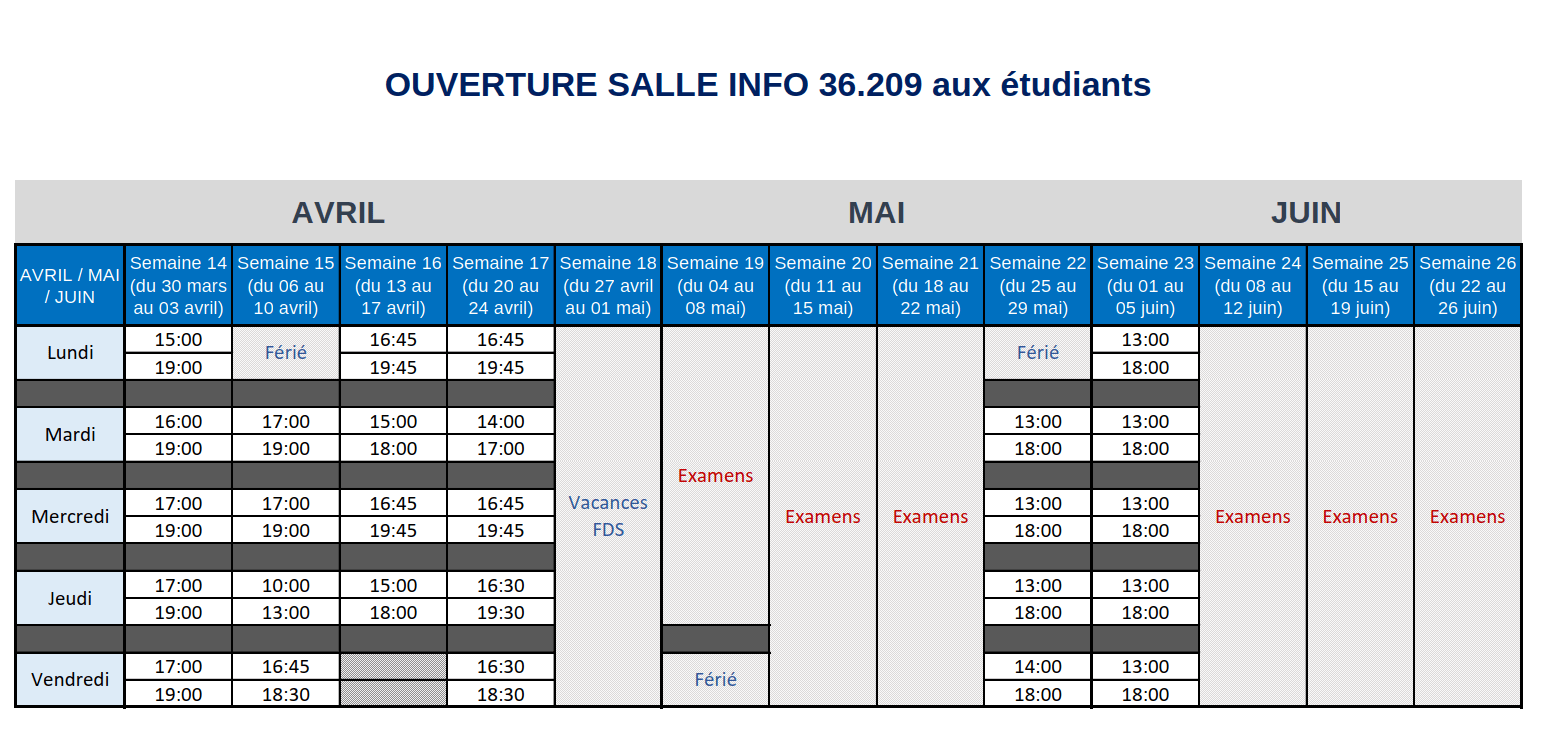 Vous trouverez ci-dessous le planning d’ouverture de la salle 36.209 pour les mois à venir…