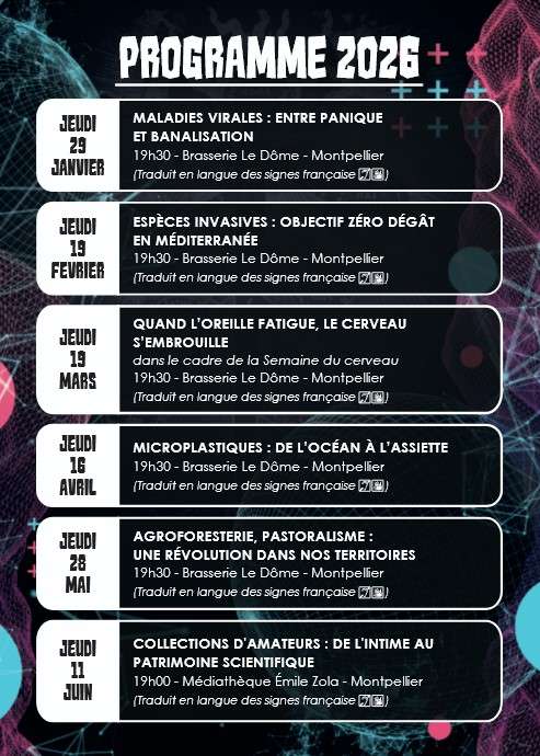 La saison est coproduite par les services de culture scientifique de l’UM et ses partenaires : INRAE Occitanie-Montpellier, IRD, Inserm et la Faculté des sciences de Montpellier.