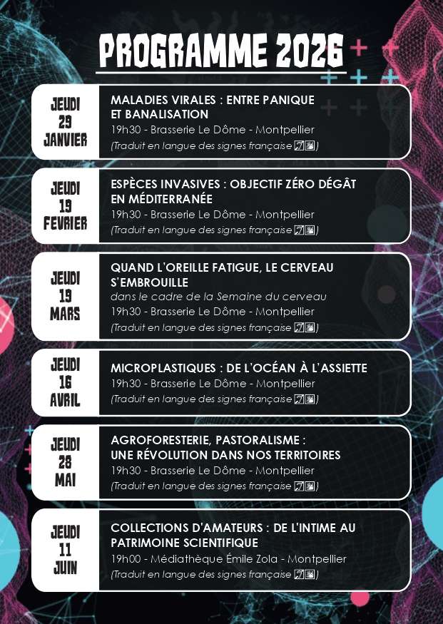 La saison est coproduite par les services de culture scientifique de l’UM et ses partenaires : INRAE Occitanie-Montpellier, IRD, Inserm et la Faculté des sciences de Montpellier.