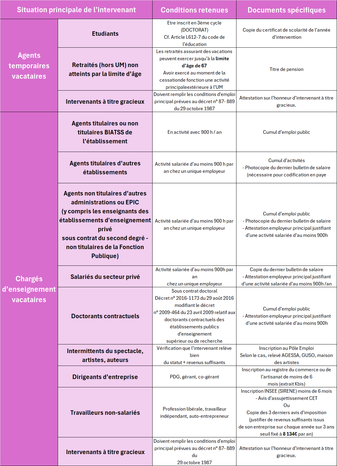 Tableau récapitulatif des conditions de recrutement et l’ensemble des pièces à fournir selon votre statut